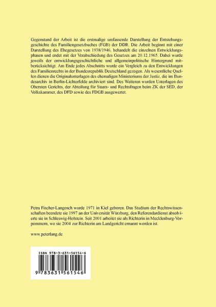 Gegenstand der Arbeit ist die erstmalige umfassende Darstellung der Entstehungsgeschichte des Familiengesetzbuches (FGB) der DDR. Die Arbeit beginnt mit einer Darstellung des Ehegesetzes von 1938/1946, behandelt die einzelnen Entwicklungsphasen und endet mit der Verabschiedung des Gesetzes am 20.12.1965. Dabei wurde jeweils der entwicklungsgeschichtliche und allgemeinpolitische Hintergrund mitberücksichtigt. Am Ende jedes Abschnitts wurde ein Vergleich zu den Entwicklungen des Familienrechts in der Bundesrepublik Deutschland gezogen. Als wesentliche Quellen dienen die Originalunterlagen des ehemaligen Ministeriums der Justiz, die im Bundesarchiv in Berlin-Lichterfelde archiviert sind. Des Weiteren wurden Unterlagen des Obersten Gerichts, der Abteilung für Staats- und Rechtsfragen beim ZK der SED, der Volkskammer, des DFD sowie des FDGB ausgewertet.