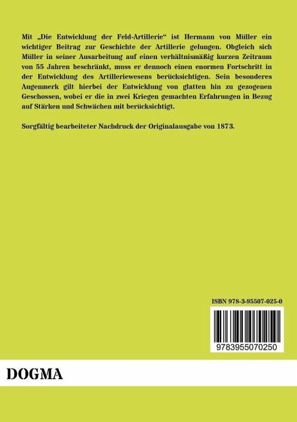 Mit Die Entwicklung der Feld-Artillerie ist Hermann von Müller ein wichtiger Beitrag zur Geschichte der Artillerie gelungen. Obgleich sich Müller in seiner Ausarbeitung auf einen verhältnismäßig kurzen Zeitraum von 55 Jahren beschränkt, muss er dennoch einen enormen Fortschritt in der Entwicklung des Artilleriewesens berücksichtigen. Sein besonderes Augenmerk gilt hierbei der Entwicklung von glatten hin zu gezogenen Geschossen, wobei er die in zwei Kriegen gemachten Erfahrungen in Bezug auf Stärken und Schwächen mit berücksichtigt.