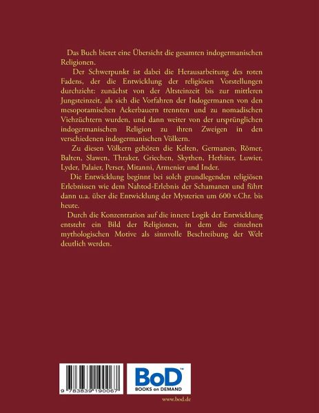 Das Buch bietet eine Übersicht über die gesamten indogermanischen Religionen. Der Schwerpunkt ist dabei die Herausarbeitung des roten Fadens, der die Entwicklung der religiösen Vorstellungen durchzieht: zunächst von der Altsteinzeit bis zur mittleren Jungsteinzeit, als sich die Vorfahren der Indogermanen von den mesopotamischen Ackerbauern trennten und zu nomadischen Viehzüchtern wurden, und dann weiter von der ursprünglichen indogermanischen Religion zu ihren Zweigen in den verschiedenen indogermanischen Völkern. Zu diesen Völkern gehören die Kelten, Germanen, Römer, Balten, Slawen, Thraker, Griechen, Skythen, Hethiter, Luwier, Lyder, Palaier, Perser, Mitanni, Armenier und Inder. Die Entwicklung beginnt bei solch grundlegenden religiösen Erlebnissen wie dem Nahtod-Erlebnis der Schamanen und führt dann u.a. über die Entwicklung der Mysterien um 600 v.Chr. bis heute. Durch die Konzentration auf die innere Logik der Entwicklung entsteht ein Bild der Religionen, in dem die einzelnen mythologischen Motive als sinnvolle Beschreibung der Welt deutlich werden.