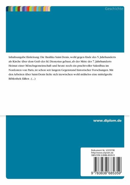 Für die neueste Forschung wollen wir uns an dieser Stelle mit dem Hinweis auf die beiden jüngsten uns zur Verfügung stehenden Arbeiten begnügen: zum einen der Aufsatz Josef Semmlers, der die Entwicklung Saint-Denis' Von der bischöflichen Coemeterialbasilika zur königlichen Benediktinerabtei sehr präzise beschreibt, zum anderen das 1988 erschienene Buch Jan van der Meulens und Andreas Speers Die fränkische Königsabtei Saint-Denis. Ostanlage und Kultgeschichte , wo der Versuch unternommen wird, die neuesten archäologischen Erkenntnisse über die Abtei mit den sie betreffenden schriftlichen Zeugnissen und den historischen Entwicklungen der Liturgie und der Kultgeschichte zu vergleichen.
