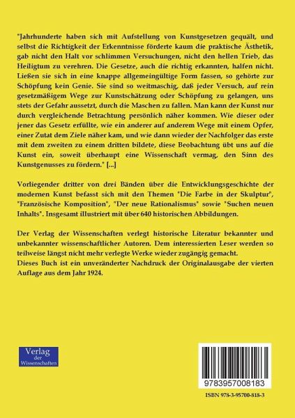 Vorliegender dritter von drei Bänden über die Entwicklungsgeschichte der modernen Kunst befasst sich mit den Themen "Die Farbe in der Skulptur", "Französische Komposition", "Der neue Rationalismus" sowie "Suchen neuen Inhalts". Insgesamt illustriert mit über 640 historischen Abbildungen.