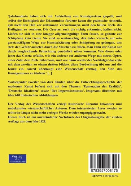 Vorliegender zweiter von drei Bänden über die Entwicklungsgeschichte der modernen Kunst befasst sich mit den Themen "Kameraden der Realität", "Deutsche Idealisten"sowie "Der Impressionismus". Insgesamt illustriert mit über 640 historischen Abbildungen.