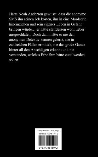 Hätte Noah Anderson gewusst, dass die anonyme SMS ihn seinen Job kosten, ihn in eine Mordserie hineinziehen und sein eigenes Leben in Gefahr bringen würde... er hätte stattdessen wohl lieber ausgeschlafen. Doch dann hätte er nie den anonymen Detektiv kennen gelernt, nie in zahlreichen Fällen ermittelt, nie das große Ganze hinter all den Anschlägen erkannt und nie verstanden, welches Erbe ihm hätte zuteilwerden sollen.