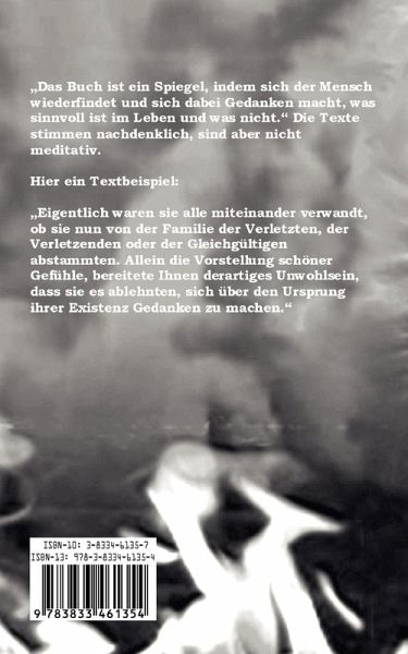 Das Buch ist ein Spiegel, in dem sich der Mensch wiederfindet und sich dabei Gedanken macht, was sinnvoll ist im Leben und was nicht. Die Texte stimmen nachdenklich, sind aber nicht meditativ. Ein Textbeispiel: ¿Eigentlich waren sie alle miteinander verwandt, ob sie nun von der Familie der Verletzten, der Verletzenden oder der Gleichgültigen abstammten. Allein die Vorstellung schöner Gefühle bereitete ihnen derartiges Unwohlsein, dass sie es ablehnten, sich über den Ursprung ihrer Existenz Gedanken zu machen.¿