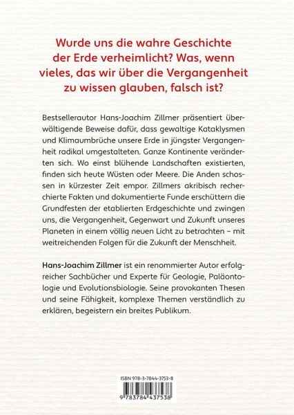 Schwere Naturkatastrophen und gravierende Klimaumstürze der letzten Jahrtausende führten zu einer grundlegenden Umbildung der Erdkruste. Besiedelte Steppen versanken in Nord- und Ostsee, Wald- und Seenlandschaften auf der Arabischen Halbinsel verwandelten sich in Wüsten und in Südamerika wuchsen die Anden in kürzester Zeit in die Höhe. Bestsellerautor Hans-Joachim Zillmer bringt durch intensiv recherchierte Fakten, überzeugende Funde und bestechende Argumentation nicht nur die bestehenden Lehrmeinungen zur Erdgeschichte ins Wanken, seine Erkenntnisse regen auch zu einer radikalen Revision der gängigen Vorstellungen von unserem Klima an. Ein unkonventioneller Blick auf Entwicklung und Zukunft unserer Erde.