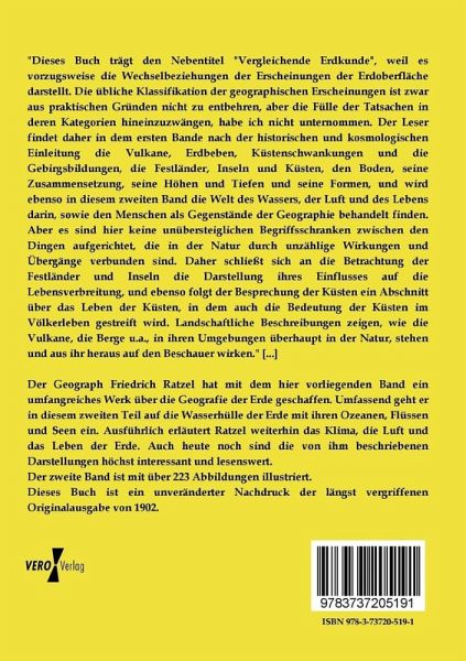 Der Geograph Friedrich Ratzel hat mit dem hier vorliegenden Band ein umfangreiches Werk über die Geografie der Erde geschaffen. Umfassend geht er in diesem zweiten Teil auf die Wasserhülle der Erde mit ihren Ozeanen, Flüssen und Seen ein. Ausführlich erläutert Ratzel weiterhin das Klima, die Luft und das Leben der Erde. Auch heute noch sind die von ihm beschriebenen Darstellungen höchst interessant und lesenswert.