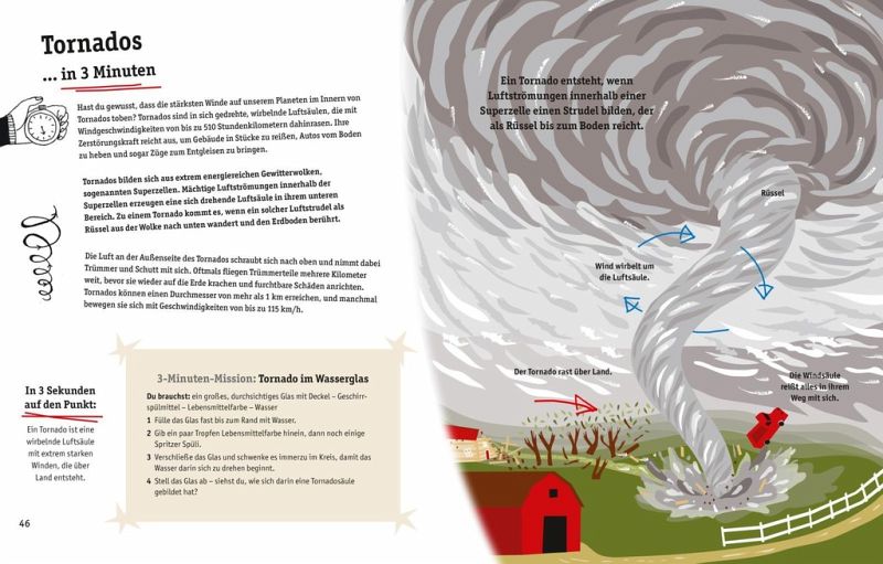 30 faszinierende Aspekte über die Erdein nur je 3 Minuten erklärt3 Minuten-Mini-Missionen zum Experimentieren und selber ausprobieren3 Sekunden Mini-Zusammenfassungen der Infoserklärende Illustrationen