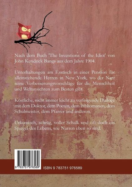 Nach dem Buch 'The Inventions of the Idiot' von John Kendrick Bangs aus dem Jahre 1904.Unterhaltungen am Esstisch in einer Pension für alleinstehende Herren in New York, wo der Narr seine Verbesserungsvorschläge für die Menschheit und Weltansichten zum Besten gibt.Köstliche, nicht immer leicht zu verfolgende Dialoge mit dem Doktor, dem Poeten, dem Bibliomanen, dem Schulmeister, dem Pfarrer und anderen. Urkomisch, schräg, voller Schalk und oft doch ein Spiegel des Lebens, wie Narren eben so sind.