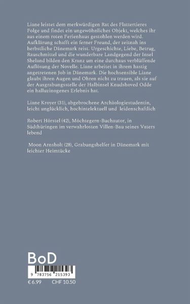 Liane leistet dem merkwürdigen Rat des Flattertieres Folge und findet ein ungewöhnliches Objekt, welches ihr aus einem roten Ferienhaus gestohlen werden wird. Aufklärung schafft ein ferner Freund, der zeitnah ins herbstliche Dänemark reist. Urgeschichte, Liebe, Betrug, Rauschmittel und die wunderbare Landgegend der Insel Sheland bilden den Kranz um eine durchaus verblüffende Auflösung der Novelle. Liane arbeitet in ihrem hastig angetretenen Job in Dänemark. Die hochsensible Liane glaubt ihren Augen und Ohren nicht zu trauen, als sie auf der Ausgrabungsstelle der Halbinsel Knudshoved Odde ein halluzinogenes Erlebnis hat. Liane Kroyer (31), abgebrochene Archäologiestudentin, leicht unglücklich, hochintelektuell und leidenschaftlichRobert Hörstel (42), Möchtegern-Buchautor, in Südthüringen im verwahrlosten Villen-Bau seines Vaters lebendMoon Arnsholt (28), Grabungshelfer in Dänemark mit leichter Heimtücke