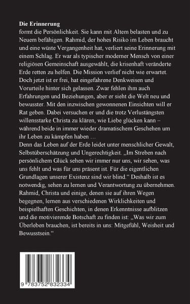 Die Erinnerung formt die Persönlichkeit. Sie kann mit Altem belasten und zu Neuem befähigen. Rahmid, der hohes Risiko im Leben braucht und eine wüste Vergangenheit hat, verliert seine Erinnerung mit einem Schlag. Er war als typischer moderner Mensch von einer religiösen Gemeinschaft ausgewählt, die krisenhaft veränderte Erde retten zu helfen. Die Mission verlief nicht wie erwartet. Doch jetzt ist er frei, hat eingefahrene Denkweisen und Vorurteile hinter sich gelassen. Zwar fehlen ihm auch Erfahrungen und Beziehungen, aber er sieht die Welt neu und bewusster. Mit den inzwischen gewonnenen Einsichten will er Rat geben. Dabei versuchen er und die trotz Verlustängsten willensstarke Christa zu klären, wie Liebe glücken kann - während beide in immer wieder dramatischem Geschehen um ihr Leben zu kämpfen haben ...Denn das Leben auf der Erde leidet unter menschlicher Gewalt, Selbstüberschätzung und Ungerechtigkeit. "Im Streben nach persönlichem Glück sehen wir immer nur uns, wir sehen, was uns fehlt und was für uns präsent ist. Für die eigentlichen Grundlagen unserer Existenz sind wir blind." Deshalb ist es notwendig, sehen zu lernen und Verantwortung zu übernehmen. Rahmid, Christa und einige, denen sie auf ihren Wegen begegnen, lernen aus verschiedenen Wirklichkeiten und beispielhaften Geschichten, in denen Erkenntnisse aufblitzen und die motivierende Botschaft zu finden ist: "Was wir zum Überleben brauchen, ist bereits in uns: Mitgefühl, Weisheit und Bewusstsein."