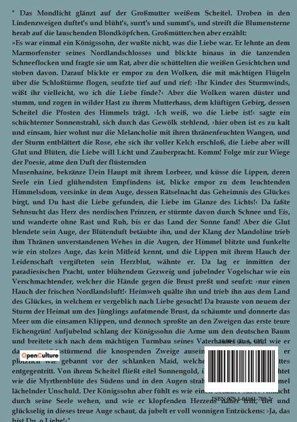 " Das Mondlicht glänzt auf der Großmutter weißem Scheitel. Droben in den Lindenzweigen duftet's und blüht's, surrt's und summt's, und streift die Blumensterne herab auf die lauschenden Blondköpfchen. Großmütterchen aber erzählt: »Es war einmal ein Königssohn, der wußte nicht, was die Liebe war. Er lehnte an dem Marmorfenster seines Nordlandschlosses und blickte hinaus in die tanzenden Schneeflocken und fragte sie um Rat, aber die schüttelten die weißen Gesichtchen und stoben davon. Darauf blickte er empor zu den Wolken, die mit mächtigen Flügeln über die Schloßtürme flogen, seufzte tief auf und rief: ¿Ihr Kinder des Sturmwinds, wißt ihr vielleicht, wo ich die Liebe finde?¿ Aber die Wolken waren düster und stumm, und zogen in wilder Hast zu ihrem Mutterhaus, dem klüftigen Gebirg, dessen Scheitel die Pfosten des Himmels trägt. ¿Ich weiß, wo die Liebe ist!¿ sagte ein schüchterner Sonnenstrahl, sich durch das Gewölk stehlend, ¿hier oben ist es zu kalt und einsam, hier wohnt nur die Melancholie mit ihren thränenfeuchten Wangen, und der Sturm entblättert die Rose, ehe sich ihr voller Kelch erschloß, die Liebe aber will Glut und Blüten, die Liebe will Licht und Zauberpracht. Komm! Folge mir zur Wiege der Poesie, atme den Duft der flüsternden Musenhaine, bekränze Dein Haupt mit ihrem Lorbeer, und küsse die Lippen, deren Seele ein Lied glühendsten Empfindens ist, blicke empor zu dem leuchtenden Himmelsdom, versinke in dem Auge, dessen Rätselnacht das Geheimnis des Glückes birgt, und Du hast die Liebe gefunden, die Liebe im Glanze des Lichts!¿ Da faßte Sehnsucht das Herz des nordischen Prinzen, er stürmte davon durch Schnee und Eis, und wanderte ohne Rast und Ruh, bis er das Land der Sonne fand! Aber die Glut blendete sein Auge, der Blütenduft betäubte ihn, und der Klang der Mandoline trieb ihm Thränen unverstandenen Wehes in die Augen, der Himmel blitzte und funkelte wie ein stolzes Auge, das kein Mitleid kennt, und die Lippen mit ihrem Hauch der Leidenschaft vergifteten sein Herzblut, wähnte er. Da lag er inmitten der paradiesischen Pracht, unter blühendem Gezweig und jubelnder Vogelschar wie ein Verschmachtender, welcher die Hände gegen die Brust preßt und seufzt: ¿nur einen Hauch der frischen Nordlandsluft!¿ Heimweh quälte ihn und trieb ihn aus dem Land des Glückes, in welchem er vergeblich nach Liebe gesucht! Da brauste von neuem der Sturm der Heimat um des Jünglings aufatmende Brust, da schäumte und donnerte das Meer um die einsamen Klippen, und dennoch sproßte an den Zweigen das erste teure Eichengrün! Aufjubelnd schlang der Königssohn die Arme um den deutschen Baum und breitete sich nach dem mächtigen Turmbau seines Vaterhauses aus, und wie er dann vorwärtsstürmend die knospenden Zweige auseinander biegt, da steht er plötzlich wie gebannt vor der schlanken Maid, welche ihm lautlosen Schrittes entgegentritt. Von ihrem Scheitel fließt eitel Sonnengold, ihr weißer Nacken leuchtet wie die Myrthenblüte des Südens und in den Augen strahlte ein tiefblauer Himmel lächelnder Unschuld. Der Königssohn aber fühlt es wie einen Schauer süßer Andacht durch seine Seele wehen, und wie er klopfenden Herzens näher tritt, tief und glückselig in dieses treue Auge schaut, da jubelt er voll wonnigen Entzückens: ¿Ja, das bist Du, o Liebe!¿"