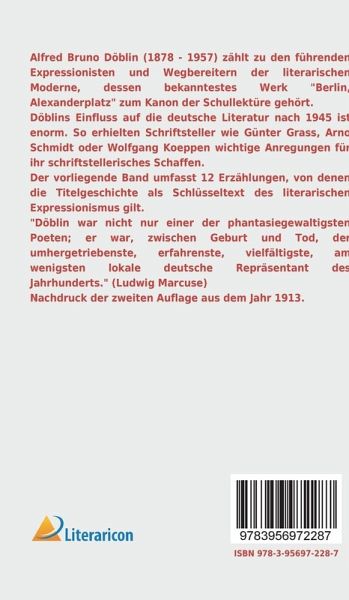 Alfred Bruno Döblin (1878 - 1957) zählt zu den führenden Expressionisten und Wegbereitern der literarischen Moderne, dessen bekanntestes Werk "Berlin, Alexanderplatz" zum Kanon der Schullektüre gehört.