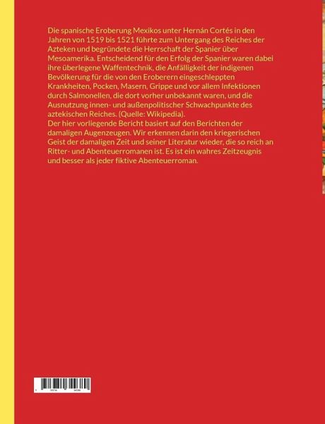 Die spanische Eroberung Mexikos unter Hernán Cortés in den Jahren von 1519 bis 1521 führte zum Untergang des Reiches der Azteken und begründete die Herrschaft der Spanier über Mesoamerika. Entscheidend für den Erfolg der Spanier waren dabei ihre überlegene Waffentechnik, die Anfälligkeit der indigenen Bevölkerung für die von den Eroberern eingeschleppten Krankheiten, Pocken, Masern, Grippe und vor allem Infektionen durch Salmonellen, die dort vorher unbekannt waren, und die Ausnutzung innen- und außenpolitischer Schwachpunkte des aztekischen Reiches. (Quelle: Wikipedia).Der hier vorliegende Bericht basiert auf den Berichten der damaligen Augenzeugen. Wir erkennen darin den kriegerischen Geist der damaligen Zeit und seiner Literatur wieder, die so reich an Ritter- und Abenteuerromanen ist. Es ist ein wahres Zeitzeugnis und besser als jeder fiktive Abenteuerroman.