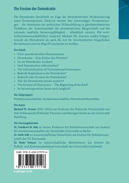 Ü ber demokratischen Dezisionismus: Kann es, sollte es gar einen demokratischen Dezisionismus geben?.- Demokratie - Eine Kultur des Westens?.- Ist die Demokratie modern?.- Sind Demokratien reformierbar?.- The Informalization of Transnational Governance.- "Bedroht Kapitalismus die Demokratie?".- Zukunft oder Erosion der Demokratie?.- War die Demokratie jemals 'modern'?.- The Erosion of Democracy - the Beginning of the End?.- Ist Systemopposition heute noch möglich?.