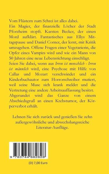 Vom Flüstern zum Schrei ist alles dabei.Ein Magier, der finanzielle Löcher der Stadt Pforzheim stopft. Karsten Becker, der einen Mord aufklärt. Fantastisches aus Ellys Mittagspause und Daniel Corner, der lernt, mit Kritik umzugehen. Offene Fragen einer Vegetarierin, die Opfer eines Vampirs wird und wie ein Mann von 50 Jahren eine neue Lebensrichtung einschlägt. Seien Sie dabei, wenn aus Irren ist menschlich - Irren ist männlich wird, eine Psychose mit Hilfe von Callas und Mozart verschwindet und ein Kinderbuchautor zum Horrorschreiber mutiert, weil seine Muse sich krank meldet und die Vertretung eine andere Arbeitsauffassung besitzt.Abgerundet wird das Ganze von einem Abschiedsgruß an einen Krebstumor, der Körperverbot erhält.Lehnen Sie sich zurück und genießen Sie zehn außergewöhnliche und abwechslungsreiche Literatur-Ausflüge.