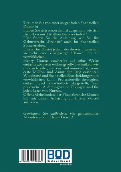 Träumen Sie von einer sorgenfreien finanziellen Zukunft? Haben Sie sich schon einmal ausgemalt, wie sich Ihr Leben mit 1 Million Euro verändert? Hier finden Sie die Anleitung, wie Sie Ihr Geburtsrecht "Freiheit" auch im finanziellen Sinne erleben. Dieses Buch bietet jedem, der diesen Traum hat, vielleicht eine einzigartige Chance ihn zu verwirklichen.Henry Graetz beschreibt auf seine Weise einfache aber sehr wirkungsvolle Techniken, wie praktisch jeder, der ein Einkommen hat, seine erste Million und damit den lang ersehnten Wohlstand und finanziellen Entscheidungsraum verwirklichen kann. Professionelle Strategien, einfach und verständlich dargestellt, mit praktischen Übungen sind für jeden Leser von Nutzen. Offene Geheimnisse der Finanzbranche können Sie mit dieser Anleitung zu Ihrem Vorteil ausbauen.Gewinnen Sie außerdem ein gemeinsames Abendessen mit Henry Graetz!