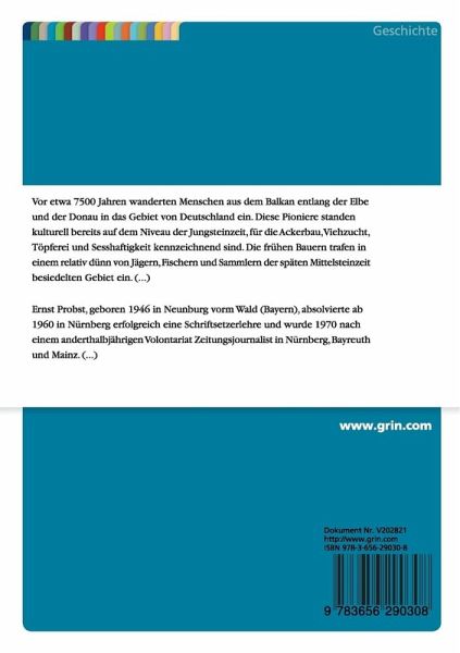 Fachbuch aus dem Jahr 2012 im Fachbereich Archäologie, , Sprache: Deutsch, Abstract: Vor etwa 7500 Jahren wanderten Menschen aus dem Balkan entlang der Elbe und der Donau in das Gebiet von Deutschland ein. Diese Pioniere standen kulturell bereits auf dem Niveau der Jungsteinzeit, für die Ackerbau, Viehzucht, Töpferei und Sesshaftigkeit kennzeichnend sind. Die frühen Bauern trafen in einem relativ dünn von Jägern, Fischern und Sammlern der späten Mittelsteinzeit besiedelten Gebiet ein. Bevorzugt ließen sie sich in Landschaften nieder, deren fruchtbare Böden sich besonders gut für Ackerbau eigneten. Jene Kolonisatoren lichteten die damaligen Eichenmischwälder durch Fällen von Bäumen mit Steinbeilen oder durch Brandrodung mit Feuer. Das Holz der Bäume verwendeten sie für den Bau von bis zu 40 Meter langen Wohnhäusern. Ihre Siedlungen lagen anfangs wie kleine Inseln im riesigen Waldmeer. Wegen der bänderartigen Verzierung ihrer Tongefäße bezeichnet man diese Bauern als Bandkeramiker,Linearbandkeramiker oder Linienbandkeramiker. Ihre Hausbauweise, ihr Keramikstil, ihr Schmuck, ihr Kunststil, ihre Bestattungsweise und ihre Religion unterscheiden sich auffällig von den Errungenschaften der vorhergehenden mittelsteinzeitlichen Jäger, Fischer und Sammler. Die Bandkeramiker schufen eine völlig neue Welt, in der eine neue Wirtschafts- und Lebensweise, aber auch neue Werte und Glaubensvorstellungen alles verdrängten, was über Jahrtausende gewachsen war. Funde der Linienbandkeramischen Kultur (etwa 5.500 bis 4.900 v. Chr.) kennt man aus Baden-Württemberg, Bayern, dem Saarland, Rheinland-Pfalz, Hessen, Nordrhein-Westfalen, dem südlichen Niedersachsen, aus Thüringen, Sachsen-Anhalt, Sachsen, Brandenburg und aus dem unteren Odergebiet. Mit diesen Einwanderern befasst sich das Taschenbuch "Die ersten Bauern in Deutschland" des Wiesbadener Wissenschaftsautors Ernst Probst. Er hat sich durch seine Werke "Deutschland in der Urzeit" (1986), "Deutschland in der Steinzeit" (1991) und "Deutschland in der Bronzezeit" (1996) in der Fachwelt einen Namen gemacht. Die Tageszeitung "Die Welt" bezeichnete "Deutschland in der Urzeit" als "Glanzstück deutscher Wissenschaftspublizistik".