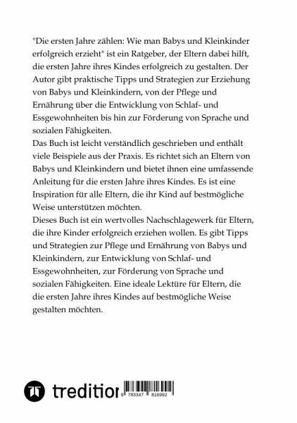 "Die ersten Jahre zählen: Wie man Babys und Kleinkinder erfolgreich erzieht" ist ein Ratgeber, der Eltern dabei hilft, die ersten Jahre ihres Kindes erfolgreich zu gestalten. Der Autor gibt praktische Tipps und Strategien zur Erziehung von Babys und Kleinkindern, von der Pflege und Ernährung über die Entwicklung von Schlaf- und Essgewohnheiten bis hin zur Förderung von Sprache und sozialen Fähigkeiten.Das Buch ist leicht verständlich geschrieben und enthält viele Beispiele aus der Praxis. Es richtet sich an Eltern von Babys und Kleinkindern und bietet ihnen eine umfassende Anleitung für die ersten Jahre ihres Kindes. Es ist eine Inspiration für alle Eltern, die ihr Kind auf bestmögliche Weise unterstützen möchten.Dieses Buch ist ein wertvolles Nachschlagewerk für Eltern, die ihre Kinder erfolgreich erziehen wollen. Es gibt Tipps und Strategien zur Pflege und Ernährung von Babys und Kleinkindern, zur Entwicklung von Schlaf- und Essgewohnheiten, zur Förderung von Sprache und sozialen Fähigkeiten. Eine ideale Lektüre für Eltern, die die ersten Jahre ihres Kindes auf bestmögliche Weise gestalten möchten.