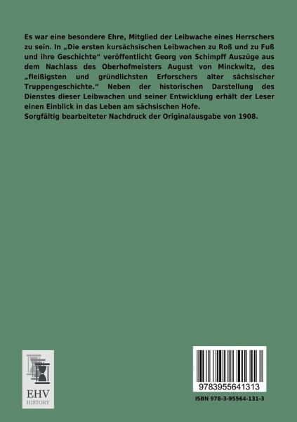 Es war eine besondere Ehre, Mitglied der Leibwache eines Herrschers zu sein. In Die ersten kursächsischen Leibwachen zu Roß und zu Fuß und ihre Geschichte veröffentlicht Georg von Schimpff Auszüge aus dem Nachlass des Oberhofmeisters August von Minckwitz, des fleißigsten und gründlichsten Erforschers alter sächsischer Truppengeschichte. Neben der historischen Darstellung des Dienstes dieser Leibwachen und seiner Entwicklung erhält der Leser einen Einblick in das Leben am sächsischen Hofe.
