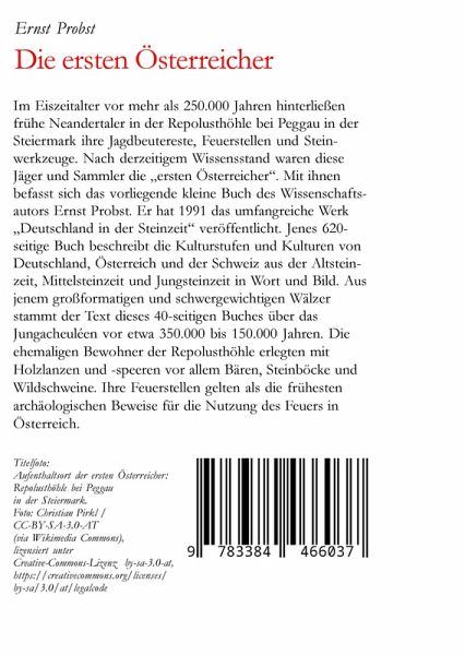 Im Eiszeitalter vor mehr als 250.000 Jahren hinterließen frühe Neandertaler in der Repolusthöhle bei Peggau in der Steiermark ihre Jagdbeutereste, Feuerstellen und Steinwerkzeuge. Nach derzeitigem Wissensstand waren diese Jäger und Sammler die "ersten Österreicher". Mit ihnen befasst sich das vorliegende kleine Buch des Wissenschaftsautors Ernst Probst. Er hat 1991 das umfangreiche Werk "Deutschland in der Steinzeit" veröffentlicht. Jenes 620-seitige Buch beschreibt die Kulturstufen und Kulturen von Deutschland, Österreich und der Schweiz aus der Altsteinzeit, Mittelsteinzeit und Jungsteinzeit in Wort und Bild. Aus jenem großformatigen und schwergewichtigen Wälzer stammt der Text dieses 40-seitigen Buches über das Jungacheuléen vor etwa 350.000 bis 150.000 Jahren. Die ehemaligen Bewohner der Repolusthöhle erlegten mit Holzlanzen und -speeren vor allem Bären, Steinböcke und Wildschweine. Ihre Feuerstellen gelten als die frühesten archäologischen Beweise für die Nutzung des Feuers in Österreich.
