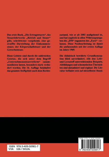 Das erste Buch, "Die Ertragsteuern", des Steuerlehrwerks "Betrieb und Steuer" gibt, schrittweise vorgehend, eine gestraffte Darstellung der Einkommensteuer, der Körperschaftsteuer und der Gewerbesteuer. Diese Gebiete sind durch die zahlreichen Gesetze, die sich unter dem Begriff "Unternehmenssteuerreform" zusammenfassen lassen, besonders stark verändert worden.