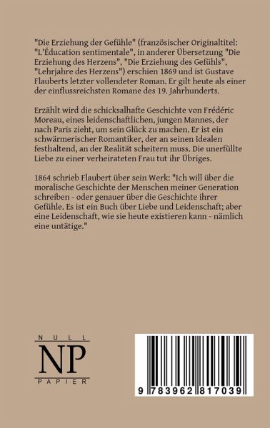 "Die Erziehung der Gefühle" (französischer Originaltitel: "L'Éducation sentimentale", in anderer Übersetzung "Die Erziehung des Herzens", "Die Erziehung des Gefühls", "Lehrjahre des Herzens") erschien 1869 und ist Gustave Flauberts letzter vollendeter Roman. Er gilt heute als einer der einflussreichsten Romane des 19. Jahrhunderts. Erzählt wird die schicksalhafte Geschichte von Frédéric Moreau, eines leidenschaftlichen, jungen Mannes, der nach Paris zieht, um sein Glück zu machen. Er ist ein schwärmerischer Romantiker, der an seinen Idealen festhaltend, an der Realität scheitern muss. Die unerfüllte Liebe zu einer verheirateten Frau tut ihr Übriges. 1864 schrieb Flaubert über sein Werk: "Ich will über die moralische Geschichte der Menschen meiner Generation schreiben - oder genauer über die Geschichte ihrer Gefühle. Es ist ein Buch über Liebe und Leidenschaft; aber eine Leidenschaft, wie sie heute existieren kann - nämlich eine untätige." ISBN 978-3-95418-127-8 (Kindle) ISBN 978-3-95418-128-5 (Epub) ISBN 978-3-95418-129-2 (PDF) ISBN 978-3-96281-703-9 (Print) Null Papier Verlag