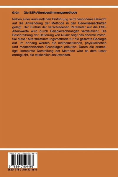 Neben einer ausführlichen Einführung wird besonderes Gewicht auf die Anwendung der Methode gelegt. Der Einfluß der verschiedenen Parameter auf die ESR-Alterswerte wird durch Beispielrechnungen verdeutlicht. Die Beschreibung der Datierung von Quarz zeigt das enorme Potential dieser Altersbestimmungsmethode für die gesamte Geologie auf. Im Anhang werden die mathematischen, physikalischen und meßtechnischen Grundlagen erläutert. Durch die erstmalige, komplette Darstellung der Methode wird es dem Leser ermöglicht, sie tatsächlich anzuwenden.