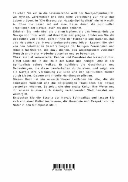 Tauchen Sie ein in die faszinierende Welt der Navajo-Spiritualität, wo Mythen, Zeremonien und eine tiefe Verbindung zur Natur das Leben prägen. In "Die Essenz der Navajo-Spiritualität" nimmt Hastiin A. Chee die Leser mit auf eine Reise durch die spirituellen Traditionen der Navajo, auch als Diné bekannt.Erfahren Sie mehr über die uralten Mythen, die das Verständnis der Navajo von ihrer Welt und ihrer Existenz prägen. Entdecken Sie die Bedeutung von Hózhó, dem Prinzip der Harmonie und Balance, das das Herzstück der Navajo-Weltanschauung bildet. Lassen Sie sich von den detaillierten Beschreibungen der heiligen Zeremonien und Rituale faszinieren, die dazu dienen, das Gleichgewicht zwischen Mensch und Natur wiederherzustellen und zu bewahren.Chee, ein tief verwurzelter Kenner und Bewahrer der Navajo-Kultur, bietet Einblicke in die Rolle der Natur und heiliger Orte in der Spiritualität seines Volkes. Er schildert die Geschichten und Bedeutungen, die diese Landschaften durchziehen, undzeigt, wie die Navajo ihre Verbindung zur Erde und den spirituellen Welten durch Lieder, Gebete und rituelle Handlungen pflegen.Dieses Buch ist ein unverzichtbarer Leitfaden für alle, die die spirituelle Weisheit und die tiefgründigen Traditionen der Navajo verstehen möchten. Es zeigt, wie eine uralte Kultur ihre Werte und ihr Wissen in einer sich ständig verändernden Welt bewahrt und weitergibt.Entdecken Sie die Essenz der Navajo-Spiritualität und lassen Sie sich von einer Kultur inspirieren, die Harmonie und Respekt vor der Natur in den Mittelpunkt stellt.