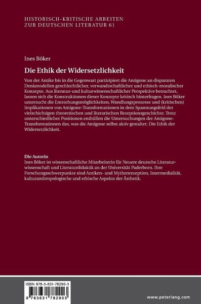 Von der Antike bis in die Gegenwart partizipiert die Antigone an disparaten Denkmodellen geschlechtlicher, verwandtschaftlicher und ethisch-moralischer Konzepte. Aus literatur-und kulturwissenschaftlicher Perspektive betrachtet, lassen sich die Konstruktionen dieser Konzepte kritisch hinterfragen. Ines Böker untersucht die Entstehungsmöglichkeiten, Wandlungsprozesse und (kritischen) Implikationen von Antigone-Transformationen in dem Spannungsfeld der vielschichtigen theoretischen und literarischen Rezeptionsgeschichte. Trotz unterschiedlicher Positionen enthüllen die Untersuchungen der Antigone-Transformationen das, was die Antigone selbst aktiv gestaltet: Die Ethik der Widersetzlichkeit.