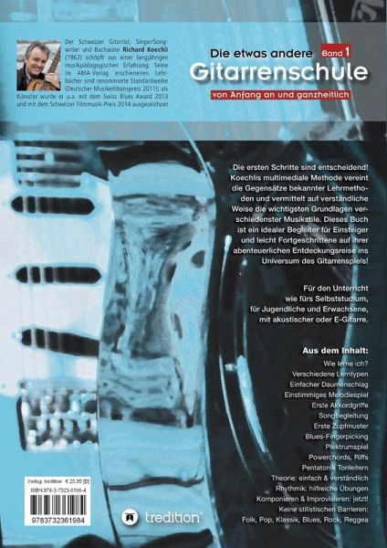 Die ersten Schritte sind entscheidend! Koechlis multimediale Methode vereint die Gegensätze bekannter Lehrmethoden, vermittelt auf verständliche Weise die wichtigsten Grundlagen verschiedenster Musikstile - und berücksichtigt die neuesten Erkenntnisse der Lernforschung. Dieses Buch ist ein idealer Begleiter für Einsteiger und leicht Fortgeschrittene auf ihrer abenteuerlichen Entdeckungsreise ins Universum des Gitarrenspiels! Für den Unterricht wie fürs Selbststudium, für Jugendliche und Erwachsene, mit akustischer oder E-Gitarre.