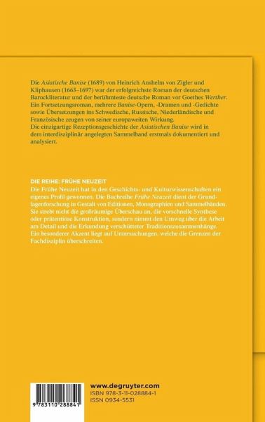 Die "Asiatische Banise" (1689) von Heinrich Anshelm von Zigler und Kliphausen (1663 1697) war der erfolgreichste Roman der deutschen Barockliteratur und der berühmteste deutsche Roman vor Goethes Werther". Wie dieser überschritt er nicht nur Gattungs-, sondern auch Sprachgrenzen. Der Roman und seine 1724 erstmals aufgelegte Fortsetzung von Johann Georg Hamann wurden im 18. Jahrhundert ins Schwedische, Russische, Niederländische und Französische übersetzt. Die einzigartige Rezeptionsgeschichte der "Asiatischen Banise" wird in dem interdisziplinär angelegten Sammelband erstmals dokumentiert und analysiert.