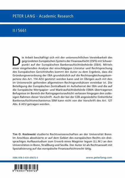 Die Arbeit beschäftigt sich mit der unionsrechtlichen Vereinbarkeit des gegründeten Europäischen Systems der Finanzaufsicht (ESFS) mit Schwerpunkt auf der Europäischen Bankenaufsichtsbehörde (EBA). Mittels einer eingehenden Analyse der einschlägigen Literatur und Rechtsprechung des Europäischen Gerichtshofes kommt der Autor zu dem Ergebnis, dass die Gründungsverordnung der EBA grundsätzlich auf die Rechtsangleichungskompetenz des Art. 114 AEU gestützt werden kann und im Übrigen auch mit den im Unionsrecht geltenden allgemeinen Rechtsgrundsätzen vereinbar ist. Die Beteiligung der Europäischen Zentralbank im Aufseherrat der EBA und die auf die Europäische Wertpapier- und Marktaufsichtsbehörde ESMA übertragenen Befugnisse im Bereich der Ratingagenturaufsicht verlassen hingegen den zulässigen Rahmen dieser Vorschrift. Auch der bei der EZB angesiedelte Einheitliche Bankenaufsichtsmechanismus SSM kann nicht von der Vorschrift des Art. 127 Abs. 6 AEU getragen werden.