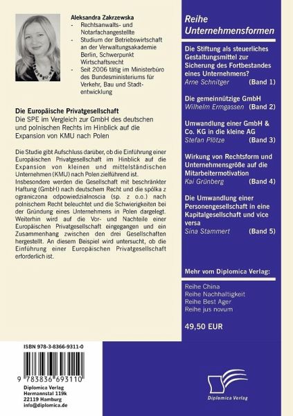 Nach der Einführung der bereits bestehenden Europa-AG für größere Unternehmen, die keinen Anklang gefunden hat, ist für die Europa-GmbH ein größerer Andrang zu erwarten, soll diese doch durch die rechtlichen Regelungen den zeitlichen und kostspieligen Aufwand einer Neugründung schmälern. Die Studie gibt Aufschluss darüber, ob eine Europäische Privatgesellschaft für kleine und mittelständische Unternehmen, die nach Polen expandieren, sinnvoll ist. Insbesondere wird ein Vergleich hergestellt zwischen den drei Gesellschaften auf europäischer, deutscher und polnischer Ebene um darzulegen, welche Vor- beziehungsweise Nachteile die Einführung der Europäischen Privatgesellschaft mit sich bringt.