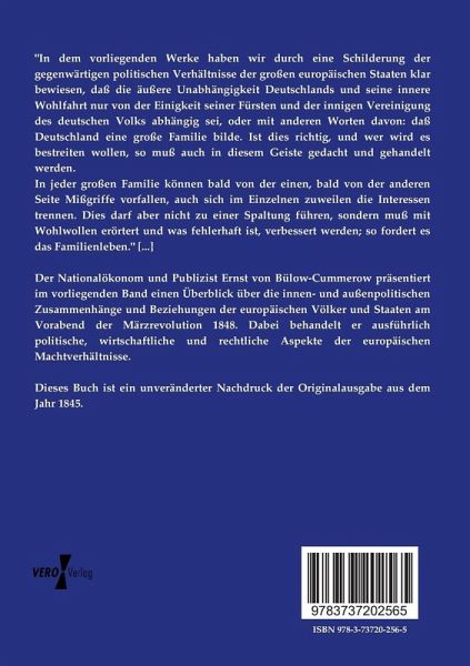 Der Nationalökonom und Publizist Ernst von Bülow-Cummerow präsentiert im vorliegenden Band einen Überblick über die innen- und außenpolitischen Zusammenhänge und Beziehungen der europäischen Völker und Staaten am Vorabend der Märzrevolution 1848. Dabei behandelt er ausführlich politische, wirtschaftliche und rechtliche Aspekte der europäischen Machtverhältnisse.