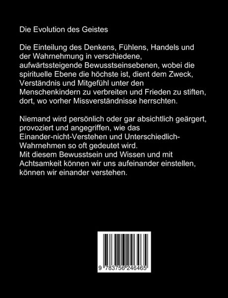Die Evolution des GeistesDie Einteilung des Denkens, Fühlens, Handels und der Wahrnehmung in verschiedene, aufwärtssteigende Bewusstseinsebenen, wobei die spirituelle Ebene die höchste ist, dient dem Zweck, Verständnis und Mitgefühl unter den Menschenkindern zu verbreiten und Frieden zu stiften, dort, wo vorher Missverständnisse herrschten. Niemand wird persönlich oder gar absichtlich geärgert, provoziert und angegriffen, wie das Einander-nicht-Verstehen und Unterschiedlich- Wahrnehmen so oft gedeutet wird. Mit diesem Bewusstsein und Wissen und mit Achtsamkeit können wir uns aufeinander einstellen, können wir einander verstehen.