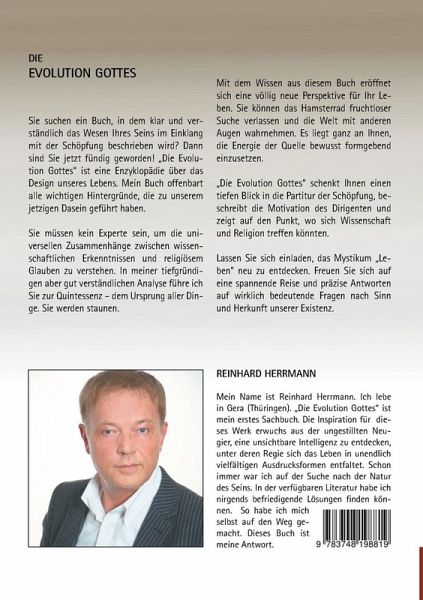Mein Name ist Reinhard Herrmann. Ich lebe in Gera (Thüringen). Die Evolution Gottes ist mein erstes Sachbuch. Die Inspiration für dieses Werk erwuchs aus der ungestillten Neugier, eine unsichtbare Intelligenz zu entdecken, unter deren Regie sich das Leben in unendlich vielfältigen Ausdrucksformen entfaltet. Schon immer war ich auf der Suche nach der Natur des Seins. In der verfügbaren Literatur habe ich nirgends befriedigende Lösungen finden können. So habe ich mich selbst auf den Weg gemacht. Dieses Buch ist meine Antwort. Meine faszinierende Erkenntnis - für jedermann nachvollziehbar hergeleitet über den heutigen Stand religiöser und wissenschaftlicher Forschungen - macht es möglich, die Evolution des Lebens als Gesamtprojekt zu begreifen und ihren Zweck zu interpretieren. Dort, wo andere Bücher enden, führt mein Buch mutig weiter. Das Grundverständnis unserer Welt und vor allem der tiefe Sinn der menschlichen Existenz werden erst erfahrbar, wenn man weiß, wie Gott tickt.