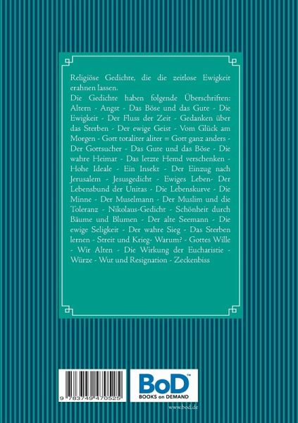 Religiöse Gedichte, die die zeitlose Ewigkeit erahnen lassen.Die einzelnen Überschriften zu den Gedichten lauten: Altern - Angst - Das Böse und das Gute - Die Ewigkeit - Der Fluss der Zeit - Gedanken über das Sterben - Der ewige Geist - Vom Glück am Morgen - Gott totaliter aliter = Gott ganz anders - Der Gottsucher - Das Gute und das Böse - Die wahre Heimat - Das letzte Hemd verschenken - Hohe Ideale - Ein Insekt - Der Einzug nach Jerusalem - Jesusgedicht - Ewiges Leben - Der Lebensbund der Unitas - Die Lebenskurve - Die Minne - Der Muselmann - Der Muslim und die Toleranz - Die unterschiedlichen Menschen - Nikolaus-Gedicht - Schönheit durch Bäume und Blumen - Der alte Seemann - Die ewige Seligkeit - Der wahre Sieg - Das Sterben lernen - Streit und Krieg - Warum? - Gottes Wille - Wir Alten - Die Wirkung der Eucharistie - Würze - Wut und Resignation - Zeckenbiss