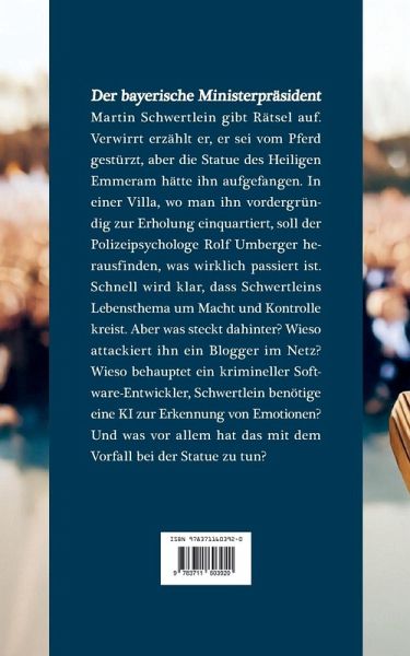 Der bayerische Ministerpräsident Martin Schwertlein gibt Rätsel auf. Verwirrt erzählt er, er sei vom Pferd gestürzt, aber die Statue des Heiligen Emmeram hätte ihn aufgefangen. In einer Villa, wo man ihn vordergründig zur Erholung einquartiert, soll der Polizeipsychologe Rolf Umberger herausfinden, was wirklich passiert ist. Schnell wird klar, dass Schwertleins Lebensthema um Macht und Kontrolle kreist. Aber was steckt dahinter? Wieso attackiert ihn ein Blogger im Netz? Wieso behauptet ein krimineller Software-Entwickler, Schwertlein benötige eine KI zur Erkennung von Emotionen? Und was vor allem hat das mit dem Vorfall bei der Statue zu tun?