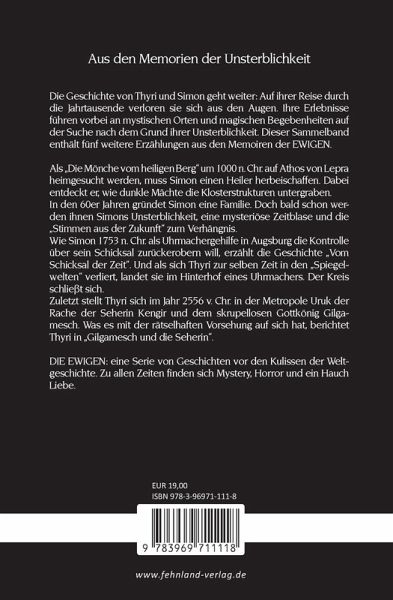 Aus den Memoiren der Unsterblichkeit Die Geschichte von Thyri und Simon geht weiter: Auf ihrer Reise durch die Jahrtausende verloren sie sich aus den Augen. Ihre Erlebnisse führen vorbei an mystischen Orten und magischen Begebenheiten auf der Suche nach dem Grund ihrer Unsterblichkeit. Dieser Sammelband enthält fünf weitere Erzählungen aus den Memoiren der EWIGEN.Als "Die Mönche vom heiligen Berg" um 1000 n. Chr. auf Athos von Lepra heimgesucht werden, muss Simon einen Heiler herbeischaffen. Dabei entdeckt er, wie dunkle Mächte die Klosterstrukturen untergraben. In den 60er Jahren gründet Simon eine Familie. Doch bald schon werden ihnen Simons Unsterblichkeit, eine mysteriöse Zeitblase und die "Stimmen aus der Zukunft" zum Verhängnis. Wie Simon 1753 n. Chr. als Uhrmachergehilfe in Augsburg die Kontrolle über sein Schicksal zurückerobern will, erzählt die Geschichte "Vom Schicksal der Zeit". Und als sich Thyri zur selben Zeit in den "Spiegelwelten" verliert, landet sie im Hinterhof eines Uhrmachers. Der Kreis schließt sich. Zuletzt stellt Thyri sich im Jahr 2556 v. Chr. in der Metropole Uruk der Rache der Seherin Ken-gir und dem skrupellosen Gottkönig Gilgamesch. Was es mit der rätselhaften Vorsehung auf sich hat, berichtet Thyri in "Gilgamesch und die Seherin".