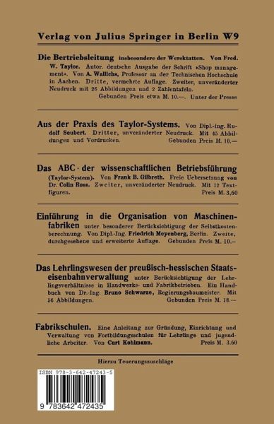I. Die industrielle Psychotechnik im Dienste der Gütererzeugung.- A. Die Berufsberatung auf Grund experimenteller Eignungsprüfung.- B. Die Psychotechnik im Dienste derRationalisierung der Arbeitsprozesse.- II. Der Güterabsatz in psychotechnischer Beleuchtung.- 1) Die psychotechnische Eichanstalt.- 2) Psychotechnik der Reklame.- Zentralstätten der angewandten.Psychotor ie. Ihre Stellung in der Organisation der Teeilnisehenand Handelshochschulen. Psychotechnik und Betriebswissenschaft.- Aussprache.- Prof. Dr. Schlesinger, Direktor des Versuellsleides für Werkzeugmaschinen und Betriebslehre an der Technischen Hochschale Charlottenburg.- Direktor Riehe, Riebe-Werk, Berlin-Weissensee, Kugellager und Werkzeugmaschinen.- Dr.-Ing. Heiland, Leiter der Lehrlingsschule der AEG: Die psychotechnische Lehrlingsprüfung der AEG.- Hr. Linke: Kritische Bedenken gegen die Untersuchungsmethodik der Psychologie.- Dr. Piorkowski: Priifung der Urteilsfähigkeit sowie der Kombinationsleistungen.- Dr. Heiland: Bedeutung der Bekanntheit des Prüflings mit den Prüfmethoden.- Dr. Moede (Schlußwort): Beantwortung der Anfragen und Widerlegung der Bedenken.- Nachwort.- Die Fortentwicklung der industriellen Psychotechnik.