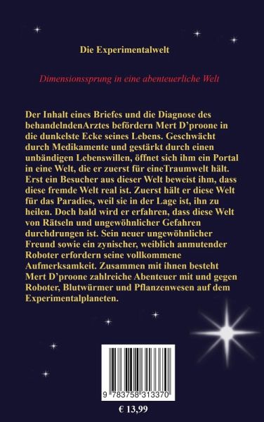 Die ExperimentalweltDer Inhalt eines Briefes und die Diagnose des behandelnden Arztes befördern Mert in die dunkelste Ecke seines Lebens. Geschwächt durch Medikamente und gestärkt durch einen unbändigen Lebenswillen, öffnet sich ihm ein Portal in eine Welt, die er zuerst für eine Traumwelt hält. Erst ein Besucher aus dieser Welt beweist ihm, dass diese fremde Welt real ist. Zuerst hält er diese Welt für das Paradies, weil sie in der Lage ist, ihn zu heilen. Doch bald wird er erfahren, dass diese Welt von Rätseln und ungewöhnlicher Gefahren durchdrungen ist. Sein neuer ungewöhnlicher Freund sowie ein zynischer, weiblich anmutender Roboter erfordern seine vollkommene Aufmerksamkeit. Zusammen mit ihnen besteht Mert zahlreiche Abenteuer mit und gegen Roboter, Blutwürmer und Pflanzenwesen auf dem Experimentalplaneten.