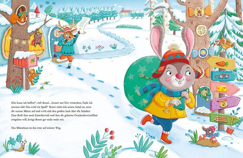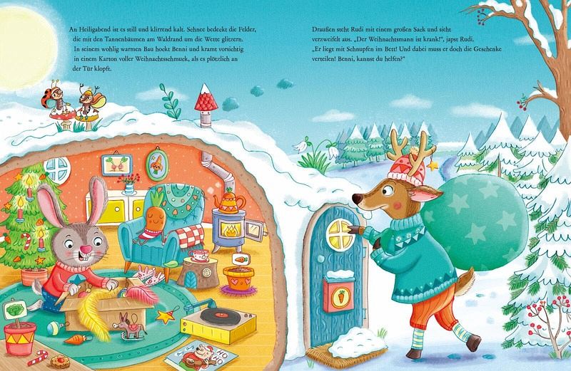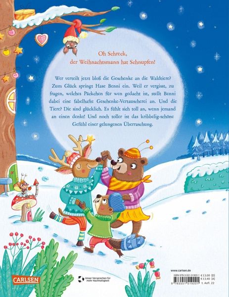 Oh Schreck, der Weihnachtsmann hat Schnupfen! Wer verteilt jetzt bloß die Geschenke an die Waldtiere? Zum Glück springt Hase Benni ein. Weil er vergisst, zu fragen, welches Päckchen für wen gedacht ist, bekommt kein Tier das, was es erwartet hat - sondern etwas viel Besseres: Dinge, von denen sie gar nicht wussten, dass sie sie gebrauchen können. Und dazu das kribbelig-schöne Gefühl einer gelungenen Überraschung. Schließlich geht es beim Weihnachtsfest darum, liebevoll bedacht zu werden und gemeinsam ein schönes Fest zu feiern. Und der Weihnachtsmann? Der ist glücklich und zufrieden - und sein Schnupfen ist auch bald wieder auskuriert.