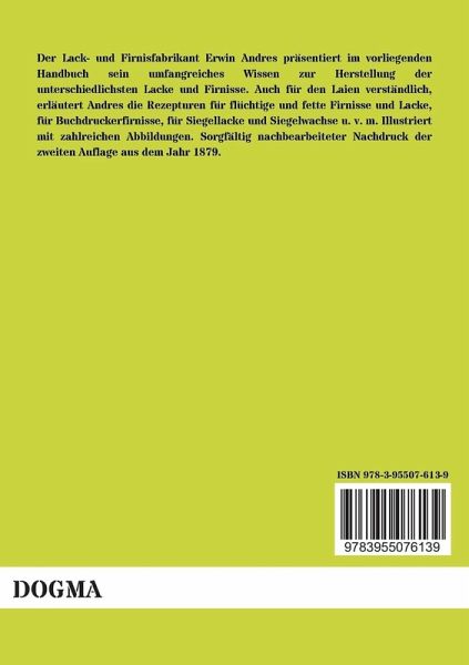 Der Lack- und Firnisfabrikant Erwin Andres präsentiert im vorliegenden Handbuch sein umfangreiches Wissen zur Herstellung der unterschiedlichsten Lacke und Firnisse. Auch für den Laien verständlich, erläutert Andres die Rezepturen für flüchtige und fette Firnisse und Lacke, für Buchdruckerfirnisse, für Siegellacke und Siegelwachse u. v. m. Illustriert mit zahlreichen Abbildungen. Sorgfältig nachbearbeiteter Nachdruck der zweiten Auflage aus dem Jahr 1879.