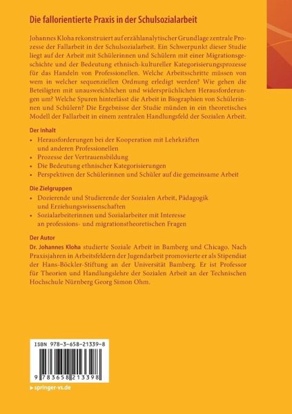 Johannes Kloha rekonstruiert auf erzählanalytischer Grundlage zentrale Prozesse der Fallarbeit in der Schulsozialarbeit. Ein Schwerpunkt dieser Studie liegt auf der Arbeit mit Schülerinnen und Schülern mit einer Migrationsgeschichte und der Bedeutung ethnisch-kultureller Kategorisierungsprozesse für das Handeln von Professionellen. Welche Arbeitsschritte müssen von wem in welcher sequenziellen Ordnung erledigt werden? Wie gehen die Beteiligten mit unausweichlichen und widersprüchlichen Herausforderungen um? Welche Spuren hinterlässt die Arbeit in Biographien von Schülerinnen und Schülern? Die Ergebnisse der Studie münden in ein theoretisches Modell der Fallarbeit in einem zentralen Handlungsfeld der Sozialen Arbeit.