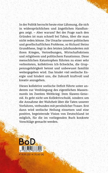 In der Politik herrscht heute eine Lähmung, die sich in widersprüchlichen und ängstlichen Handlungen zeigt. - Aber warum? Bei der Frage nach den Gründen ist man schnell bei Tabus, über die man nicht reden könne. Die Ursache unserer politischen und gesellschaftlichen Probleme, so Richard Steins Grundthese, liegt in den letzten Jahrhunderten mit ihren Kriegen, Vertreibungen, Wirtschaftskrisen und religiösem und politischem Fanatismus. Diese menschlichen Katastrophen führten zu einer sehr verbreiteten, kollektiven Ich-Schwäche, die Gruppenzugehörigkeit betont und unbewusst familiär weitergegeben wird. Das bindet viel seelische Energie und hindert uns, die Zukunft kraftvoll und kreativ anzugehen. Dieses kollektive seelische Defizit führte unter anderem zur Verdrängung des eigentlichen Massenmords im Zweiten Weltkrieg: Dem Slawen-Genozid. Es geht nicht um Kollektivschuld, sondern um die Annahme der Wahrheit über die Taten unserer Vorfahren, verbunden mit persönlicher Trauer. Erst dann wird seelische Heilung einsetzen und eine positive, begeisternde Vision von Deutschland ist möglich, für die im vorliegenden Buch konkrete Vorschläge gemacht werden.
