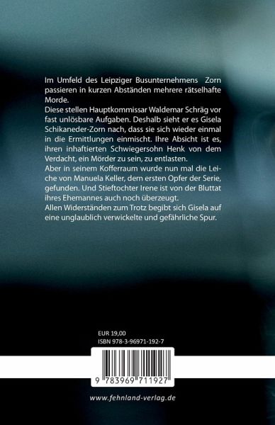 Im Umfeld des Leipziger Busunternehmens Zorn passieren in kurzen Abständen mehrere rätselhafte Morde.Diese stellen Hauptkommissar Waldemar Schräg vor fast unlösbare Aufgaben. Deshalb sieht er es Gisela Schikaneder-Zorn nach, dass sie sich wieder einmal in die Ermittlungen einmischt. Ihre Absicht ist es, ihren inhaftierten Schwiegersohn Henk von dem Verdacht, ein Mörder zu sein, zu entlasten.Aber in seinem Kofferraum wurde nun mal die Leiche von Manuela Keller, dem ersten Opfer der Serie, gefunden. Und Stieftochter Irene ist von der Bluttat ihres Ehemannes auch noch überzeugt.Allen Widerständen zum Trotz begibt sich Gisela auf eine unglaublich verwickelte und gefährliche Spur.