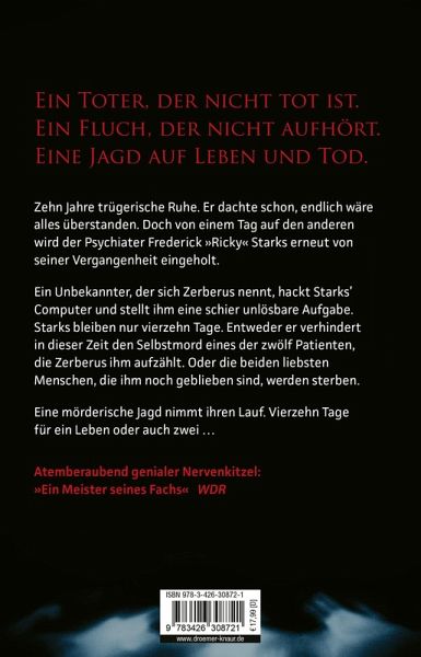 Doch als die Polizei den Selbstmord eines seiner Patienten meldet, argwöhnt Starks sofort, dass der Mann in Wirklichkeit umgebracht wurde. Kurz darauf hackt ein Unbekannter, der sich Zerberus nennt, Starks' Computer und trägt ihm ein Rätsel auf: Binnen vierzehn Tagen muss Starks den Selbstmord eines der zwölf Patienten verhindern, die Zerberus ihm aufzählt. Scheitert er, sterben die beiden liebsten Menschen, die ihm noch geblieben sind.