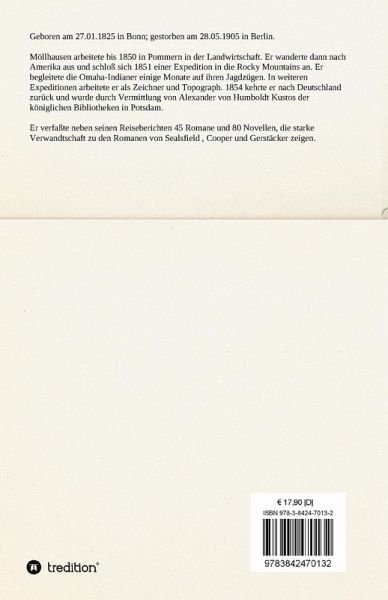 Geboren am 27.01.1825 in Bonn; gestorben am 28.05.1905 in Berlin.Möllhausen arbeitete bis 1850 in Pommern in der Landwirtschaft. Er wanderte dann nach Amerika aus und schloß sich 1851 einer Expedition in die Rocky Mountains an. Er begleitete die Omaha-Indianer einige Monate auf ihren Jagdzügen. In weiteren Expeditionen arbeitete er als Zeichner und Topograph. 1854 kehrte er nach Deutschland zurück und wurde durch Vermittlung vonAlexander von HumboldtKustos der königlichen Bibliotheken in Potsdam.Er verfaßte neben seinen Reiseberichten 45 Romane und 80 Novellen, die starke Verwandtschaft zu den Romanen vonSealsfield,CooperundGerstäckerzeigen.