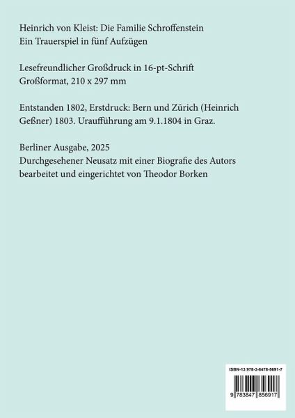 Heinrich von Kleist: Die Familie Schroffenstein. Ein Trauerspiel in fünf Aufzügen Lesefreundlicher Großdruck in 16-pt-Schrift Großformat, 210 x 297 mm Berliner Ausgabe, 2025 Durchgesehener Neusatz mit einer Biografie des Autors bearbeitet und eingerichtet von Theodor Borken Entstanden 1802, Erstdruck: Bern und Zürich (Heinrich Geßner) 1803. Uraufführung am 9.1.1804 in Graz. Textgrundlage ist die Ausgabe: Heinrich von Kleist: Werke und Briefe in vier Bänden. Herausgegeben von Siegfried Streller in Zusammenarbeit mit Peter Goldammer und Wolfgang Barthel, Anita Golz, Rudolf Loch, Berlin und Weimar: Aufbau, 1978. Umschlagabbildung: Anselm Feuerbach, Romeo und Julia, 1864 Gesetzt aus der Minion Pro, 16 pt. Henricus - Edition Deutsche Klassik GmbH