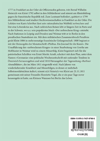 1777 in Frankfurt an der Oder als Offizierssohn geboren, tritt Bernd Wilhelm Heinrich von Kleist 1792 selbst in den Militärdienst und nimmt am Rheinfeldzug gegen die französische Republik teil. Zum Leutnant befördert, quittiert er 1799 den Militärdienst und studiert Rechtswissenschaften in Frankfurt an der Oder. Die Lektüre von Kants Schriften lässt sein rationalistisches Weltbild zerbrechen und löst eine Lebenskrise aus. Nach zahlreichen Reisen lebt er längere Zeit in Paris und in der Schweiz, wo u.a. sein populärstes Stück "Der zerbrochene Krug" entsteht. Nach Stationen in Leipzig und Dresden und Weimar tritt er in Berlin in den preußischen Staatsdienst ein. Mit dem militärischen Zusammenbruch Preußens gerät Kleist 1806 in mehrmonatige französische Gefangenschaft. 1808 beginnt er mit der Herausgabe der Monatsschrift "Phöbus. Ein Journal für die Kunst". Die Uraufführung des "zerbrochenen Kruges" in einer Bearbeitung von Goethe am Hoftheater in Weimar wird zu einem Misserfolg. Kleist begeistert sich für die patriotischen Schriften von Ernst Moritz Arndt, scheitert mit dem Plan, unter dem Namen "Germania" eine politische Wochenzeitschrift mit nationaler Tendenz in Österreich herauszugeben und wird 1810 Herausgeber der Tageszeitung "Berliner Abendblätter", die im März 1811 eingestellt wird. Nach Jahren von wiederkehrender Krankheit und Misserfolgen, in denen er mehrfach Selbstmordabsichten äußert, nimmt sich Heinrich von Kleist am 21.11.1811 gemeinsam mit seiner Freundin Henriette Vogel, die er ein paar Tage zuvor kennengelernt hatte, am Kleinen Wannsee bei Berlin das Leben.